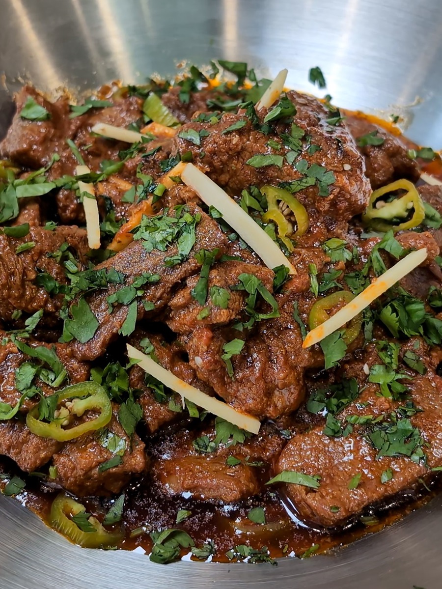 Beef cooked with green chili tomatoes, onions, and traditional spices